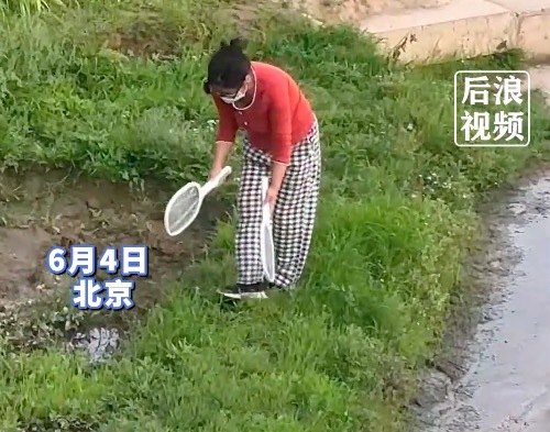 6月4日,北京。大妈手持两个电蚊拍,沿着河边走在草丛里“噼里啪啦”打蚊子,“一路火花带闪电”,网友纷纷表示:这精神状态太解压了。