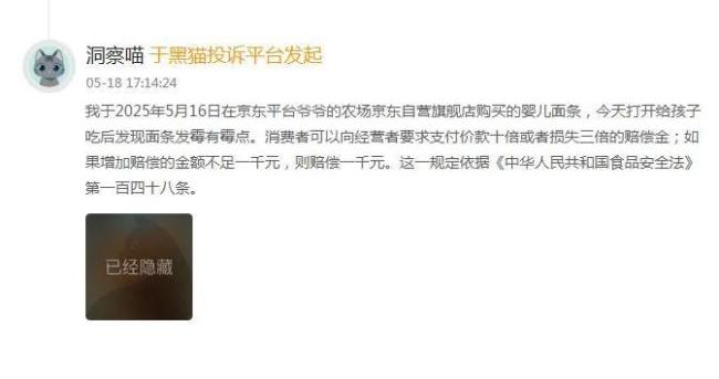 近三年来,鳌头财经未发现“爷爷的农场”因产品不合格被查,但消费者最有发言权。5月18日,一位消费者投诉称,“我于2025年5月16日在京东平台'爷爷的农场京东自营旗舰店'购买的婴儿面条,18日打开后发现面条发霉有霉点。”