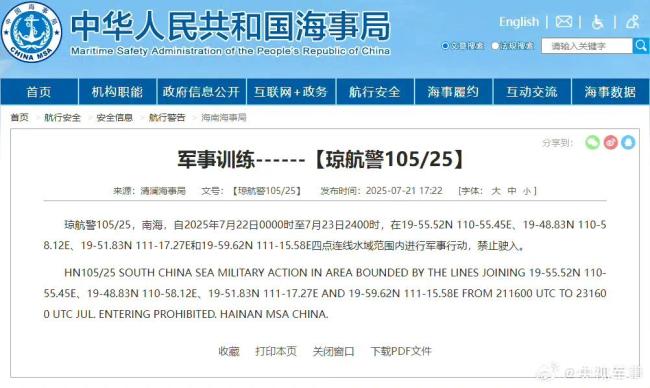 最新:南海部分水域军事训练禁止驶入