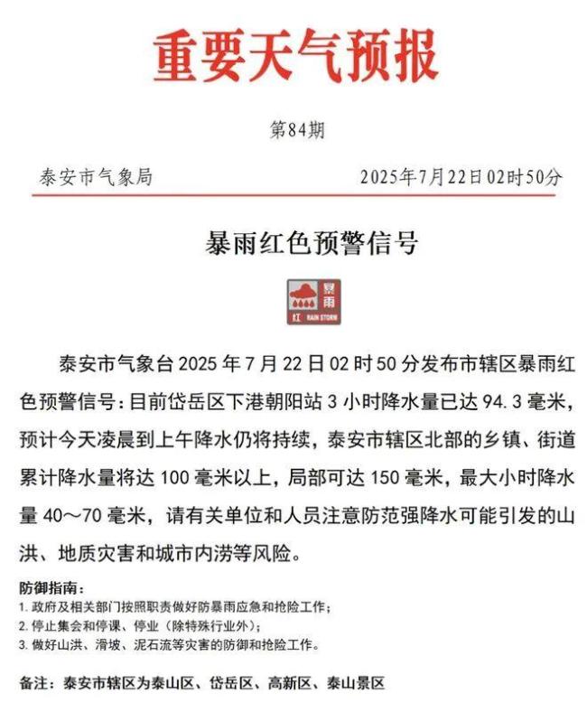 泰安市气象台于7月22日02时50分发布市辖区暴雨红色预警信号,指出岱岳区下港朝阳站3小时内降水量已达94.3毫米,预计当天凌晨到上午降水持续,泰安市北部乡镇、街道累计降水量将超过100毫米,局部可达150毫米,最大小时降水量为40至70毫米。提醒有关单位和人员注意防范强降水引发的山洪、地质灾害和城市内涝等风险。