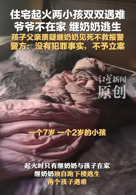孩子的父亲对此感到非常不解,一直在寻求追究继奶奶的责任,并报了警。然而,警方调查后认定没有犯罪事实,不予立案。在孩子小姨的社交账号上,详细描述了事件经过,引发了大量网友对继奶奶行为的指责。有人认为,如果是亲生母亲遇到这种情况,即使自己无法逃脱,也会尽力让孩子先逃出来。也有人对继奶奶的年龄表示惊讶,觉得她在这个年纪就当上了奶奶,这在同龄人中并不多见。此外,爷爷的态度也令人困惑,他对孙子们的遇难似乎毫无愧疚感,甚至不再认自己的儿子。