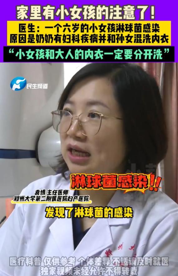 6岁女孩和奶奶混洗内衣感染妇科病 大人小孩内衣要分开洗!近日,郑州大学第二附属医院妇产科接诊了一位6岁的小女孩。她因出现妇科病症状前来就诊,最终被查出感染了淋球菌。医生进一步了解病史后发现,小女孩和奶奶同住,老人在洗衣服时会将自己和孩子的内衣混在一起清洗。而这位老人自身也有妇科阴道炎症。