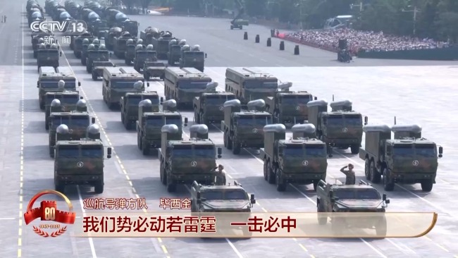 作为受阅装备方阵的压轴巨阵,战略打击群由巡航导弹方队、高超声速导弹方队、核导弹第一方队和核导弹第二方队组成,展示了强大的军力和保卫国家安全及世界和平的能力。
