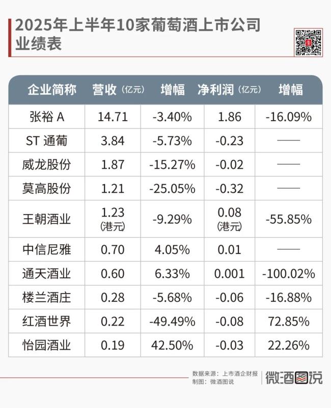 据统计,今年上半年,10家葡萄酒上市公司的营收总额为24.75亿元,净利润为1.20亿元。其中,多数公司出现了营收、净利润的双降,仅有张裕、王朝、中信尼雅、通天酒业实现了盈利,其余均处于亏损状态。