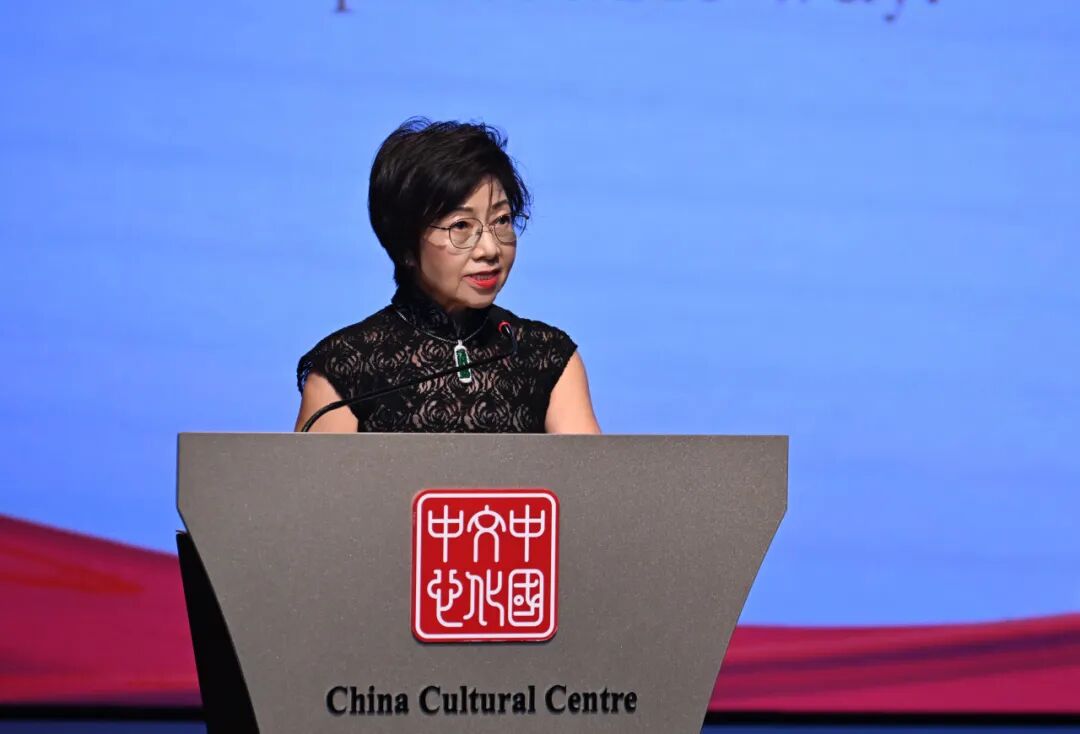 新加坡中国文化中心兼旅游办事处主任、中国文化中心执行理事会主席孔媛在活动现场致辞。新加坡中国文化中心供图