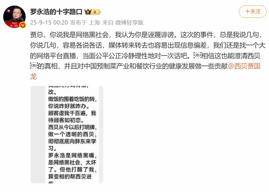 在西贝创始人贾国龙道歉的截图流传出后,罗永浩15日凌晨发文回应称: