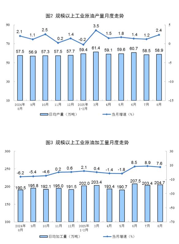 原油生产增速加快。8月份,规上工业原油产量1826万吨,同比增长2.4%,增速比7月份加快1.2个百分点;日均产量58.9万吨。