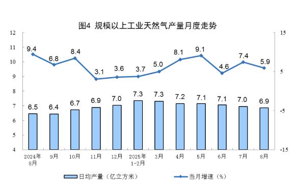 天然气生产稳定增长。8月份,规上工业天然气产量212亿立方米,同比增长5.9%;日均产量6.9亿立方米。