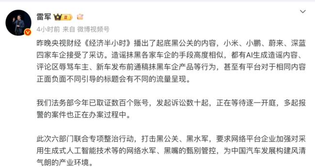 近日,央视财经播出了关于黑公关的调查报道,小米、小鹏、蔚来和深蓝四家车企接受了采访。雷军在9月13日发文称,法务部今年已对数百个账号进行取证,并发起了数十起诉讼。