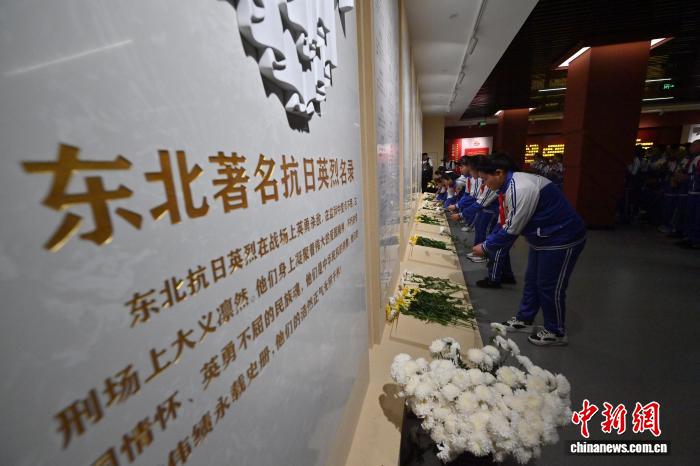 9月18日,吉林长春,青年学生为先烈敬献鲜花。张瑶 摄