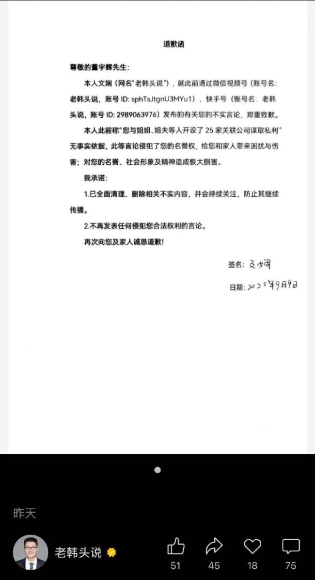 9月15日,博主“老韩头说”向董宇辉发布道歉函:本人此前称“您与姐姐、姐夫等人开设了25家关联公司谋取私利”无事实依据,此等言论侵犯了您的名誉权,给您和家人带来困扰与伤害;对您的名誉、社会形象及精神造成极大损害。本人承诺:已全面清理、删除相关不实内容,并会持续关注,防止其继续传播。不再发表任何侵犯您合法权利的言论。再次向您及家人诚恳道歉。