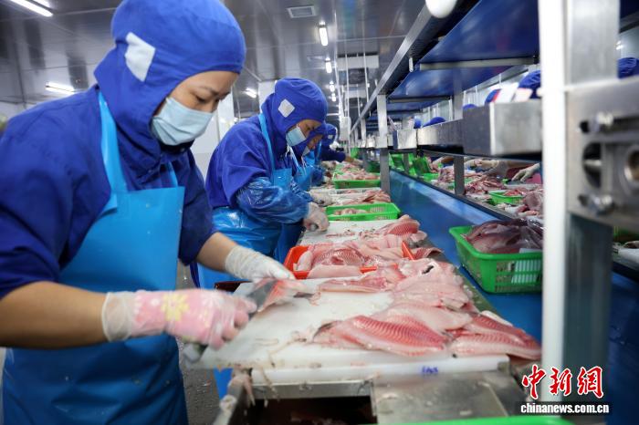 在化州杨梅镇的广东环球水产食品公司生产车间,记者看到工人们正在熟练地将去鳞去鳃的罗非鱼“开膛破肚”清洗内脏,去除血污和杂质。还有工人对切好的鱼片进行筛选,剔除碎肉、骨片等不合格品。合格鱼片经沥干后,快速采用真空包装或用保鲜膜密封,储存到低温冷库,等待检疫出口。