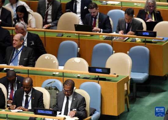 9月22日,在位于纽约的联合国总部举行的和平解决巴勒斯坦问题和落实“两国方案”高级别国际会议上,以色列代表缺席。新华社记者 李睿 摄