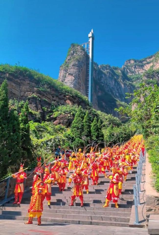 在五龙口景区桃都山,众多“孙悟空”扮演者手持金箍棒,伴随旋律齐舞。经吉尼斯认证官现场确认,成功挑战了“最多人装扮成孙悟空聚会”的世界纪录。