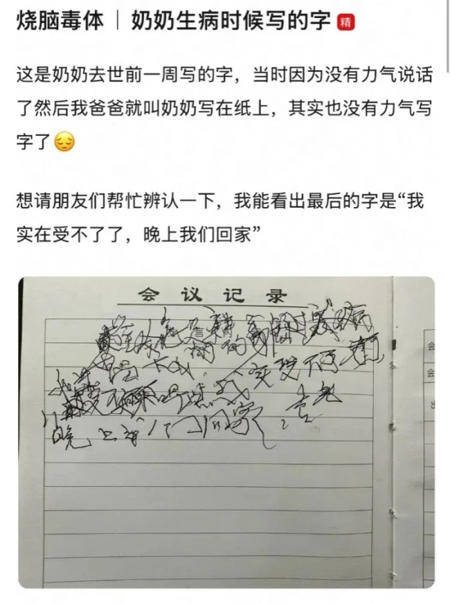 改变发生在2023年5月,那是冀梦雨记得的最早的求助帖:“求助者的奶奶在病房里写了一些字,她认不出来,所以她来求助了。因为我们小组一直是娱乐为主的,第一次出现这个帖子,我心情非常沉重。”