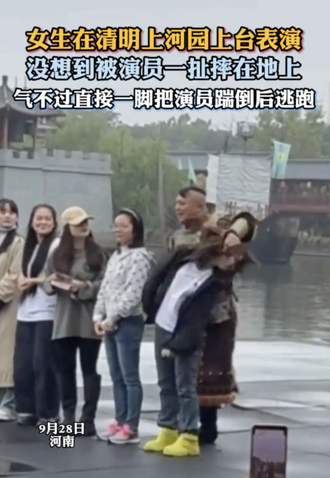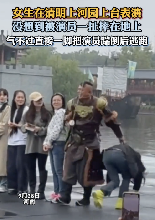 清明上河园:女生上台表演被演员扯摔在地上,