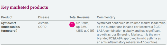 阿斯利康开发的布地奈德福莫特罗是由吸入性糖皮质激素(ICS)布地奈德和长效β2受体激动剂(LABA)福莫特罗组成的复方制剂,其具有协同的抗炎和平喘作用,可以让患者获得相当于或优于加倍剂量ICS的疗效,并可增加患者的依从性,减少大剂量ICS的不良反应,尤其适合于中至重度哮喘患者的长期治疗。