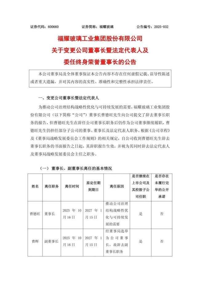 早前,福耀玻璃发布公告称,公司董事长曹德旺因推动公司治理结构战略性优化与可持续发展的需要,辞去董事长职务,但仍将继续担任公司董事及部分子公司的董事、董事长和法定代表人职务。公司选举曹晖为新任董事长,并任命其为法定代表人及董事局战略发展委员会主任。曹德旺被委任为公司终身荣誉董事长。此次职务变动不会对公司正常经营活动产生不利影响。