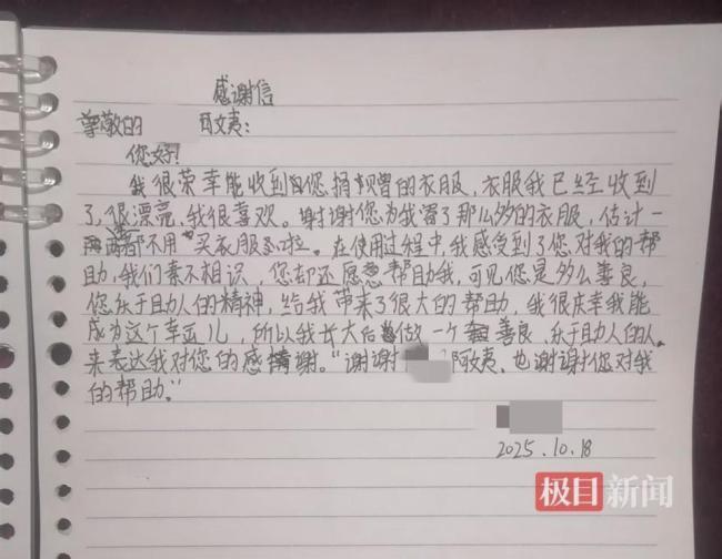 10月13日,陈女士再次打包了20余斤衣服寄出。几天后,她收到了14岁女孩阿伍的一段视频和一封感谢信。视频中,女孩穿着陈女士捐赠的衣服,微笑着表示感谢。感谢信中写道:“衣服我已经收到了,很漂亮,我很喜欢”“您乐于助人的精神,给我带来了很大的帮助,我很庆幸能成为这个幸运儿,所以我长大后要做一个善良、乐于助人的人。”