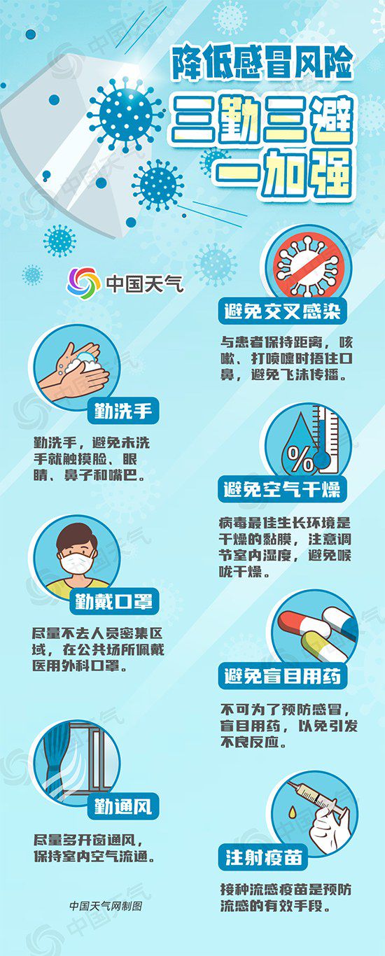 中国天气网提醒,秋冬时节冷空气活跃,气温多起伏,感冒多发。良好的生活习惯有助于预防感冒,建议大家日常生活中均衡饮食、适量运动、保证充足睡眠,避免过度劳累。同时在流感高发时期外出尽量戴好口罩,注意勤消毒,还可通过注射疫苗降低流感风险。(文/江漪 设计/王维一 数据支持/董静舒 李宁 审核/祁保刚 刘红欣 张慧 刘文静 余晓芬)