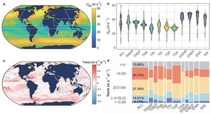 全球极端风速(50年重现期风速)空间分布及其变化趋势。研究团队 供图