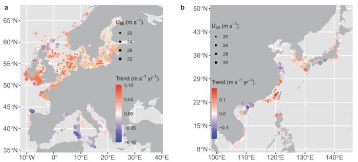 研究团队还发现,亚洲和欧洲约40%以上的现役和规划中海上风电场位于风速超过三级涡轮机设计载荷(设计能承受的最大风速为每秒37.5米)的区域。同时,超过一半的相关海域极端风速呈显著增强态势。他们认为,该增强模式与全球变暖下的气旋活动变化有关。