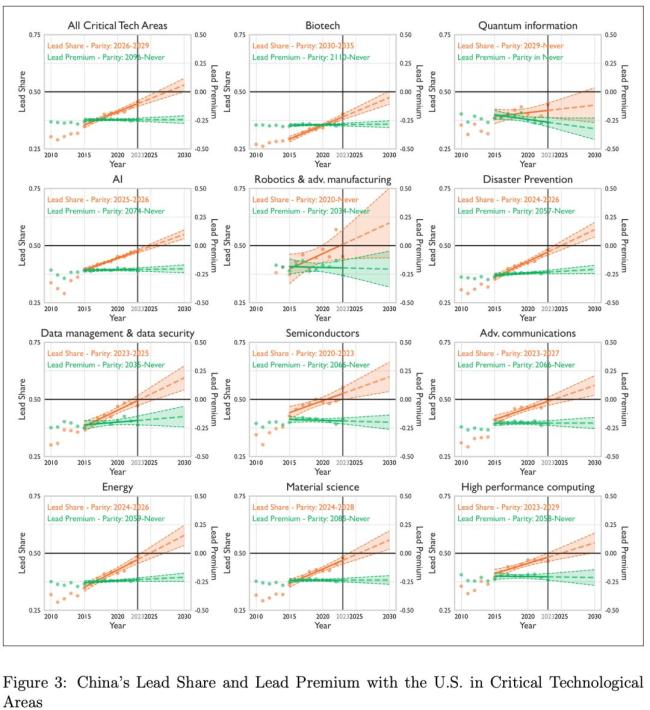 科学实力的较量集中在人工智能、半导体、通信等关键前沿领域。过去这些领域长期由西方国家主导,如今中国正迅速缩小差距并在部分领域实现领跑。例如,在人工智能领域,中国不仅发表的人工智能研究论文数量位居世界第一,专利产出也高居榜首。更重要的是,中国的人工智能系统性能进步神速,已将与美国的差距从两年前的“双位数”提升到如今几乎持平。
