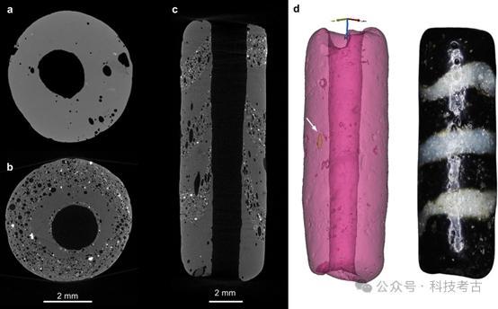 在本项研究中,中泰合作团队通过显微计算机扫描成像(CT)、拉曼光谱和光电子能谱等多种先进科技手段,系统解析了黑白条纹仿玛瑙玻璃珠的配方组成、呈色机制及成型工艺。他们研究发现,这些玻璃珠采用两种特殊玻璃类型组合制成:白色部分为矿物钠钙铝型玻璃,使用二氧化锡作为乳浊剂;黑色部分则为矿物混合料钙铝(m-mixed-Ca-Al)型玻璃,由铁硫发色团与四价锰共同作用实现呈色效果。(完)