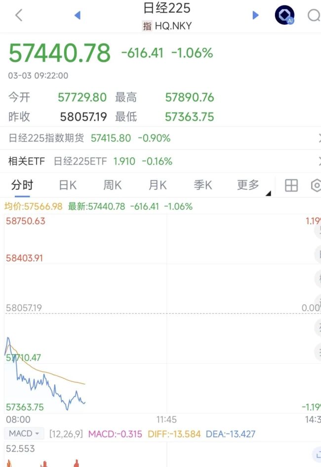 3月3日,日韩股市开盘大跌。截至发稿,日经225跌1.06%,韩国首尔综指跌幅扩大至1.83%,报6130.04点。韩元兑美元跌1.5%。韩国金融市场昨日因假期休市。