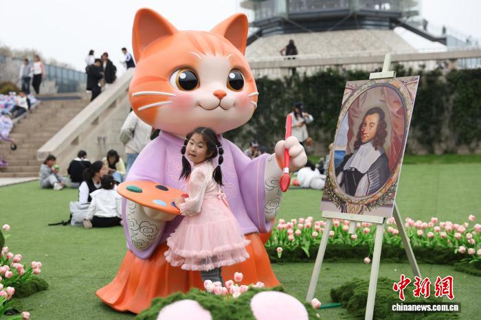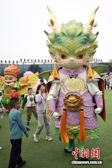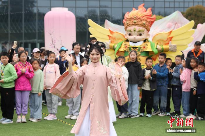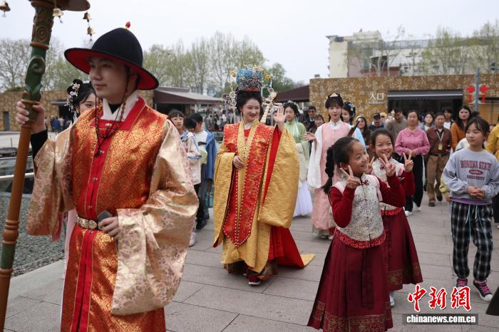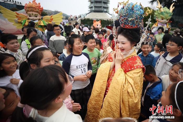 4月2日,江苏南京,孩子们在大报恩寺遗址博物馆春日文化盛会中与巡游的演员互动。中新社记者 泱波 摄