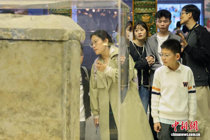 4月2日,江苏南京,孩子跟随着家长在大报恩寺遗址博物馆参观展陈的文物。中新社记者 泱波 摄