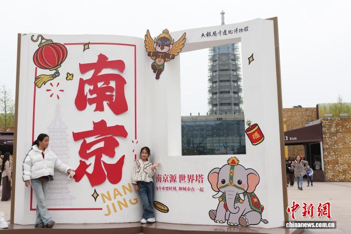 4月2日,江苏南京,孩子在大报恩寺遗址博物馆门口拍摄照片。中新社记者 泱波 摄