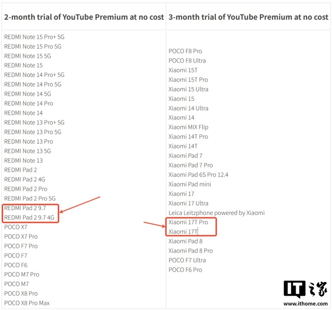 访问小米英国YouTube Premium试用活动页面时,发现以下机型已被列出: - REDMI Pad 2 9.7 4G - REDMI Pad 2 9.7 - Xiaomi 17T - Xiaomi 17T Pro