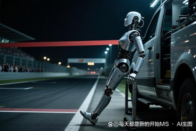 最引人注目的场景出现在冲线之后。一台自主导航机器人完成比赛后,并没有立刻停止,而是径直走向工作车,一只脚搭在车架上,稳稳地“坐”了上去,摆出一副“傲娇休息”的姿态。这一幕被现场镜头完整捕捉,引发围观者阵阵笑声。