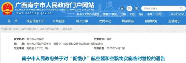 4月12日,南宁市人民政府门户网站发布关于对“低慢小”航空器和空飘物实施临时管控的通告,