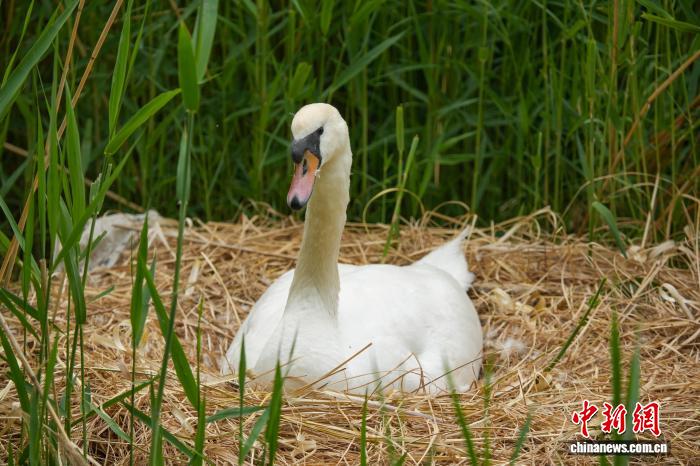 4月16日,河南郑州,随着气温回升,当地疣鼻天鹅进入孵化期。图为郑州北龙湖湿地公园,疣鼻天鹅在巢中孵蛋。中新社记者 范晓恒 摄