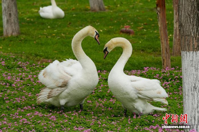 4月16日,河南郑州,随着气温回升,当地疣鼻天鹅进入孵化期。图为郑州北龙湖湿地公园,疣鼻天鹅在草地觅食、活动。中新社记者 范晓恒 摄