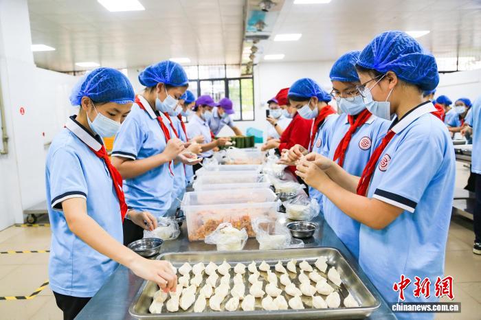 隔壁操作台前,竹筒饭的清香逐渐飘出。学生们将浸泡好的糯米与腊肉丁、玉米粒拌匀,小心填入新鲜竹筒。“要压得实,竹香才能渗进去。”壮族学生罗伟华扶稳竹筒,同伴用铁勺仔细捣实。另一边的艾草青团制作区,学生们揉捏着青绿色的面团,填入芝麻花生馅料。现场还设有包饺子区,学生们从起初的生疏,到逐渐捏出匀称的饺褶。
