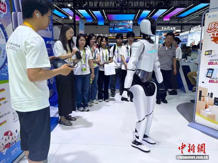 4月15日,香港青少年走进第六届中国国际消费品博览会参观导览机器人,感受前沿科技魅力。中新网记者 符宇群 摄