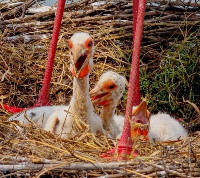 4月13日下午,工作人员通过监控画面观察到,一只东方白鹳站在用枯枝搭建的鸟巢边缘,小心翼翼地守护着四只雏鸟。这些雏鸟刚出生两周,其中一只伸长脖子向天空鸣叫,扇动的小翅膀羽毛还未长齐,红色细长的腿颤颤巍巍。其他三只偎依在一起,偶尔挪动一下,往窝内的草堆里钻,场面温馨又有趣。