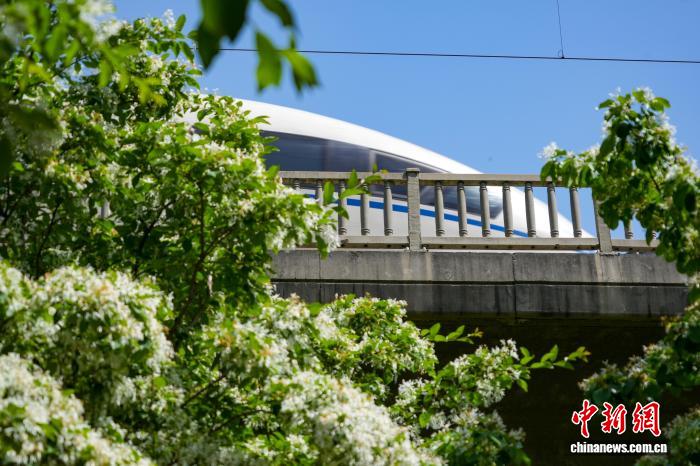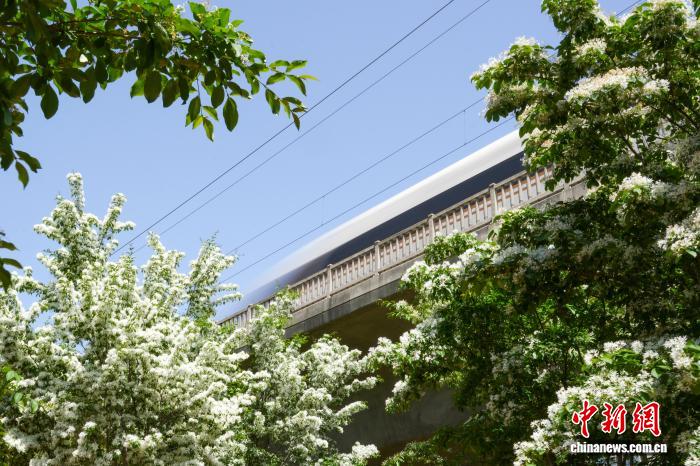 图为高铁列车穿行于盛开的流苏花间。中新社记者 范晓恒 摄
