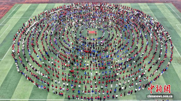 图为在广西三江侗族自治县古宜镇江川小学,学生齐跳多耶舞。龚普康 摄