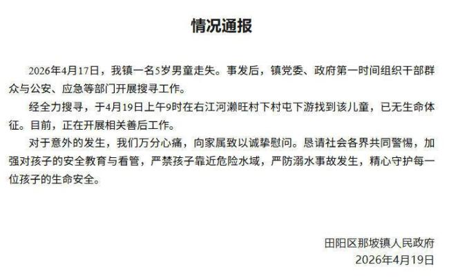 4月17日,广西百色田阳区那坡镇一名5岁男童走失。事发后,那坡镇党委和政府立即组织干部群众与公安、应急等部门展开搜寻工作。经过全力寻找,于4月19日上午9时在右江河濑旺村下村屯下游找到了这名儿童,遗憾的是他已经没有生命体征。目前,相关善后工作正在进行中。