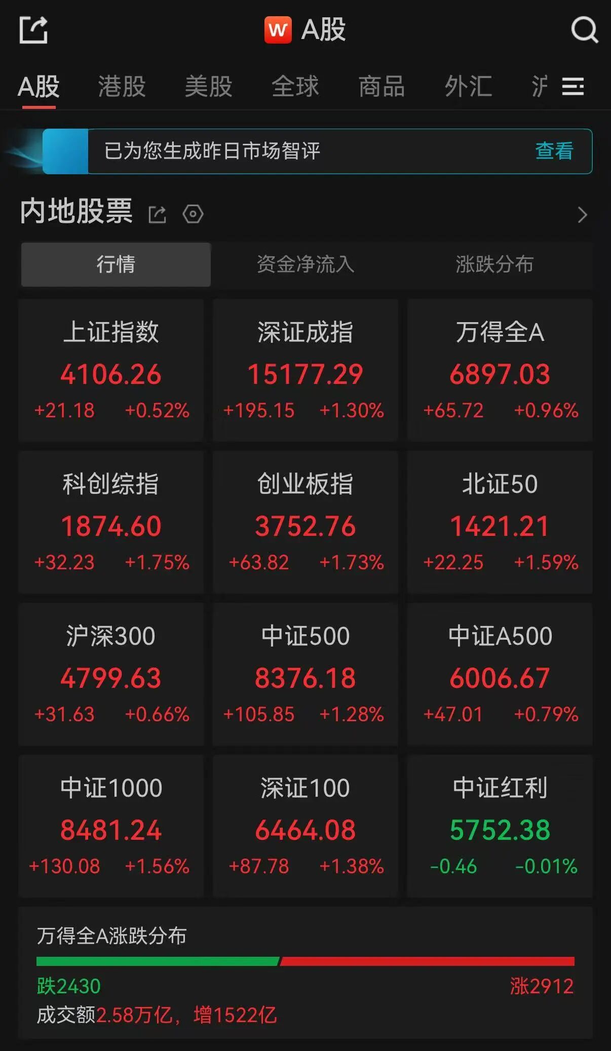 全市成交额2.58万亿,超2900只个股上涨。