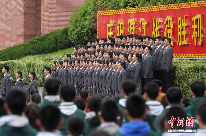 4月23日,江苏南京,庆祝渡江战役胜利暨南京解放77周年升国旗仪式在渡江胜利纪念馆渡江胜利纪念广场举行。图为学生代表朗诵《渡江战歌》。中新社记者 泱波 摄