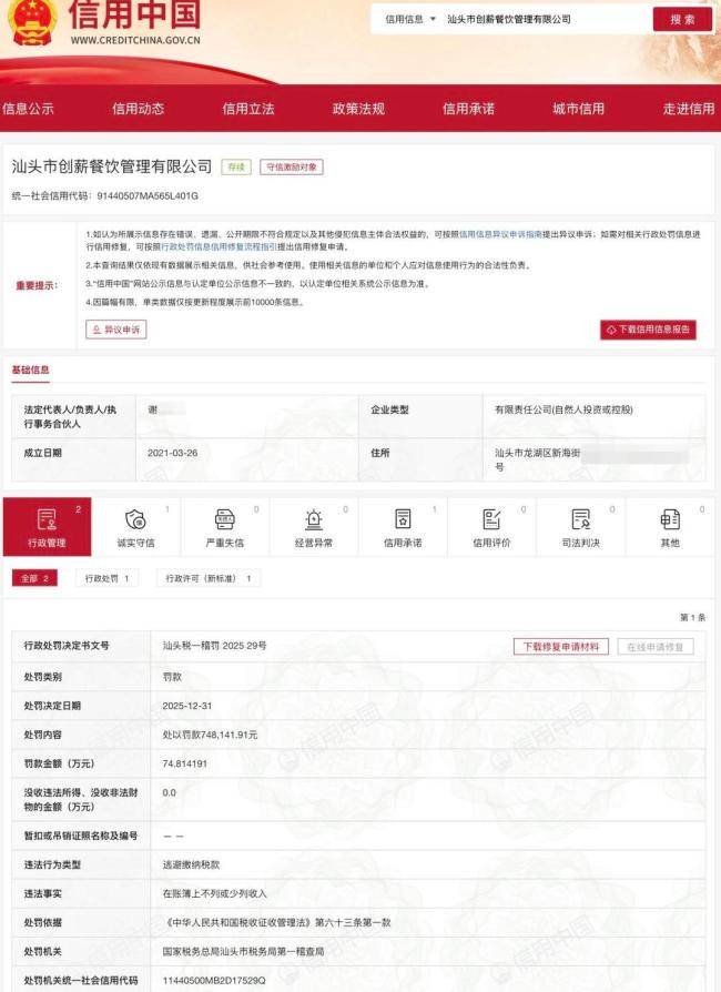 网红餐饮店因逃税被罚74万余元,店铺回应 正常营业无可奉告