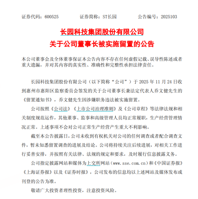ST长园董事长兼法定代表人乔文健因涉嫌职务违法被留置,这让本就处于治理困境中的ST长园再添变数。