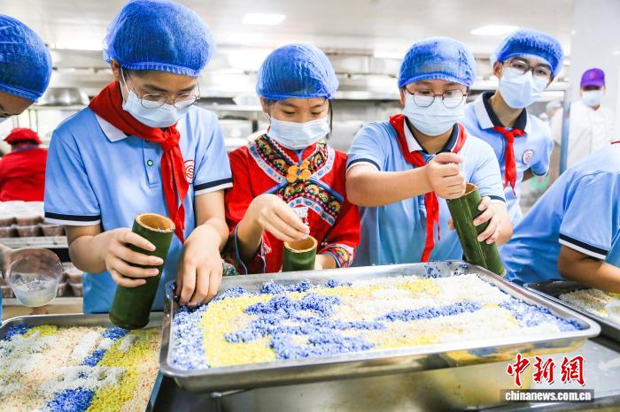 中新网梧州4月16日电(张广权魏铭均陈文思)4月15日,广西梧州市苍梧第一初级中学食堂里,五色糯米饭在学生们指尖流转,逐渐拼出“团结”“传承”的字样。这是“三月三”前夕,该校民族美食文化主题活动的一幕。百余名