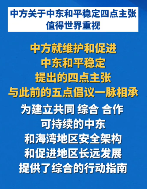 中方就维护和促进中东和平稳定提出的四点主张与此前的五点倡议一脉相承,为建立共同、综合、合作、可持续的中东和海湾地区安全架构和促进地区长远发展提供了综合的行动指南。中东国家尤其应坚持统筹发展和安全。中方愿同中东海湾国家分享中国式现代化机遇,厚...