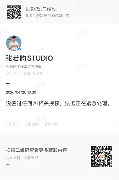 2026年4月20日,张若昀工作室通过官方账号明确否认签署过任何AI授权,并声明法务已介入处理相关侵权传闻。张若昀工作室发布公告,强调“没签过任何AI相关授权”,并指出法务团队正在紧急处理虚假信息